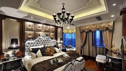 主卧设计简约但不单调。吊灯与衣帽间的材质相呼应。床头简约三个层板,挂墙式吊灯,功能完善。